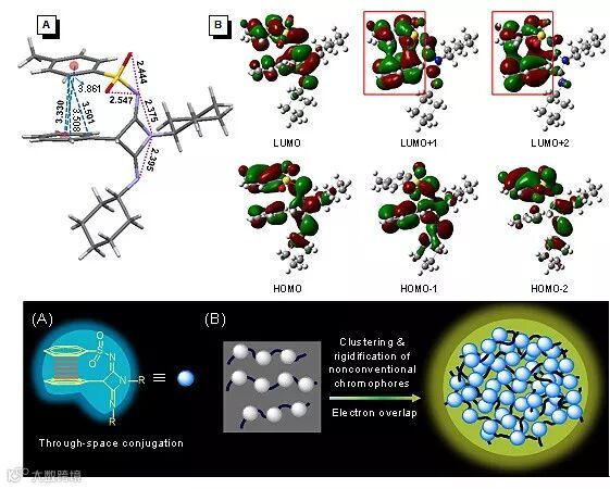 图2. 模型化合物实验与理论计算结果分析及非传统发光现象的机理解释示意图
