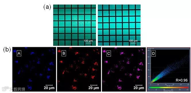 图3. (a) 聚合物薄膜制备出的二维荧光光刻图案;(b) 开环后聚合物的细胞成像结果及其与LysoTracker Red成像结果之间的对比