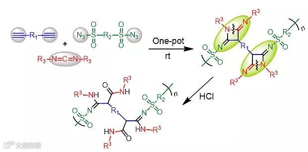 近日,香港科技大学的唐本忠院士团队开发出一种简易的室温一锅法多组分聚合路线,成功制备出一系列多功能易开环的小杂环聚合物。该聚合路线只需将简单易得的二炔、二磺酰叠氮和碳二亚胺单体及碘化亚铜催化剂加入到同一个反应容器中,以二氯甲烷作为溶剂,在室温下搅拌即可高效生成含有富杂原子氮杂环丁烷结构的聚合物材料。这一聚合方法具有操作简单、反应条件温和、效率高、环境友好、原子经济性高等优势。此外,所得到的聚合物骨架中氮杂四元环结构可以快速高效地发生酸介导的开环反应,在酸性条件下搅拌半小时即可以高达100%的转化率产生具有酰胺和脒基元全新结构的聚合物。这一特性既丰富了聚合物的结构,也可以很好地调控所得聚合物材料的性能及相应的应用范围。