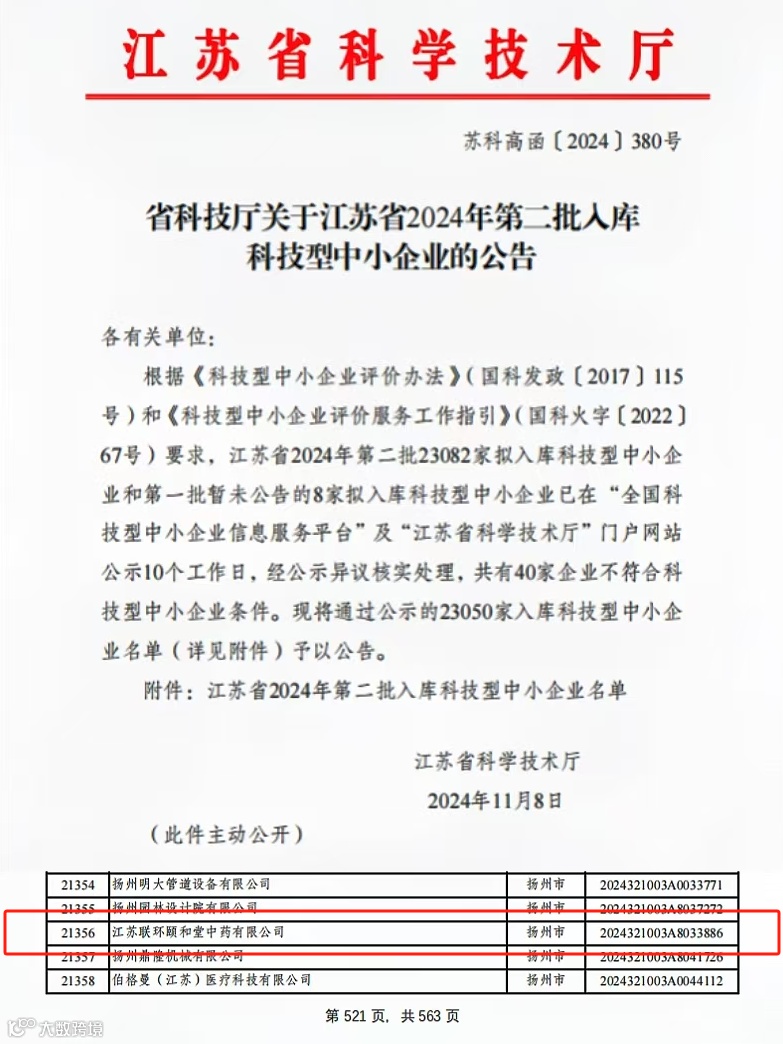 近日,江苏省科技厅发布了“江苏省2024年第二批入库科技型中小企业名单”,江苏联环颐和堂中药有限公司成功上榜。