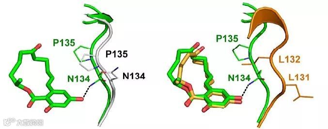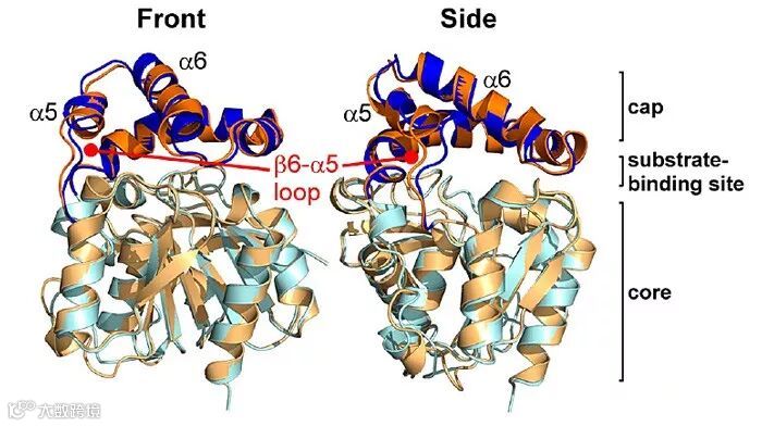 图2.(A)RmZHD的整体结构(蓝色)与ZHD101(桔色)的比较;(B)结合底物后β6-α5环的构象变化;左:RmZHD结合底物前(灰色)后(绿色)β6-α5环和N134的构象变化;右:RmZHD(绿色)和ZHD101(桔色)结合底物后的差别。