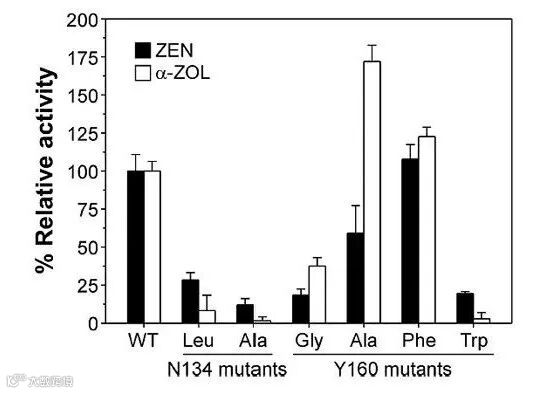 为了分析降解酶高活性的分子基础以及进一步提高其对高毒性衍生底物α-ZOL的活力,作者解析了RmZHD及其底物的复合体结构。经过分析发现,RmZHD采取一种典型的α/β水解酶构象,整体结构由一个催化核心区和帽子结构域组成。在两个结构域中间是底物结合口袋和催化三联体S102-H242-E126(图2A)。RmZHD的整体结构和底物结合氨基酸及ZHD101类似,催化三联体保守。二者较大的区别出现在帽子区域,尤其是β6-α5环更向内摆动,离底物结合口袋更近(图2B)。尤其当RmZHD结合底物以后,该环距离底物更近。其中一个氨基酸N134与ZEN的苯环O4形成新的氢键,而在ZHD101中的相应位置是Leu,在底物结合后没有发生构象变化(图2B)。将N134突变为Leu或Ala后,降解酶的活性大幅度降低,展现出该位置氨基酸在催化中的重要作用(图3)。