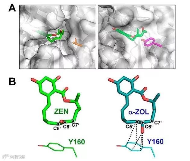 图4. 底物和160位氨基酸的相互作用。(A)ZHD101(左)和RmZHD(右)中,160位的氨基酸采取不同的构象;(B)RmZHD中,Y160与底物ZEN形成π堆叠,而与底物α-ZOL形成较大的位阻。