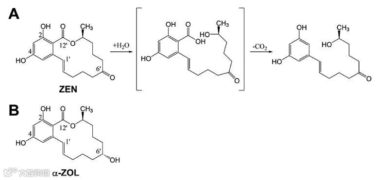 图1. ZEN、α-ZOL的分子结构及ZHD101催化反应