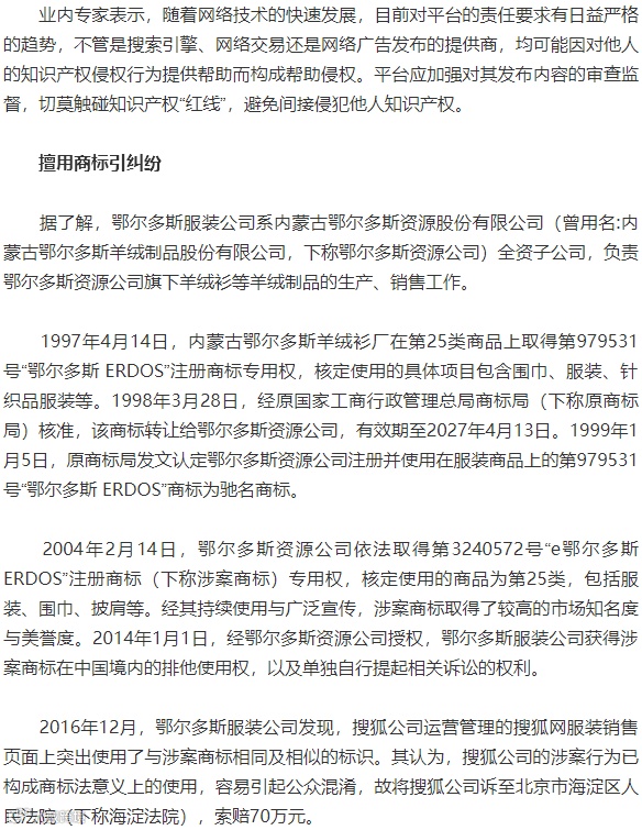因认为搜狐网发布的广告信息涉嫌侵犯该公司的注册商标专用权,内蒙古鄂尔多斯服装有限公司(下称鄂尔多斯服装公司)将搜狐网的运营者北京搜狐互联网信息服务有限公司(下称搜狐公司)诉至法院。