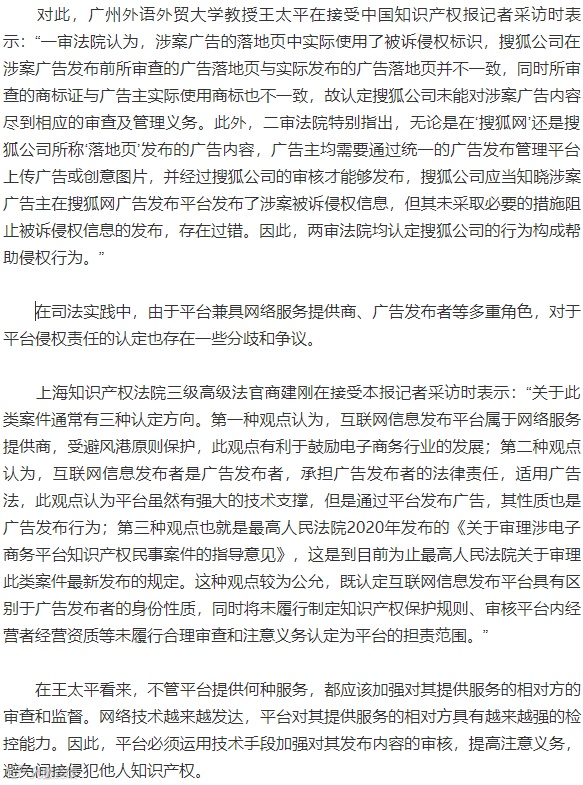 近日,北京知识产权法院对该案作出终审判决,认定搜狐公司作为涉案广告的发布者,未尽到对涉案广告的审查义务,依法应承担帮助侵权的法律责任,判决搜狐公司赔偿鄂尔多斯服装公司经济损失及合理开支共计10万余元,维持了一审判决。