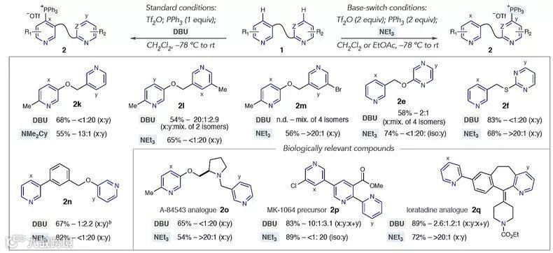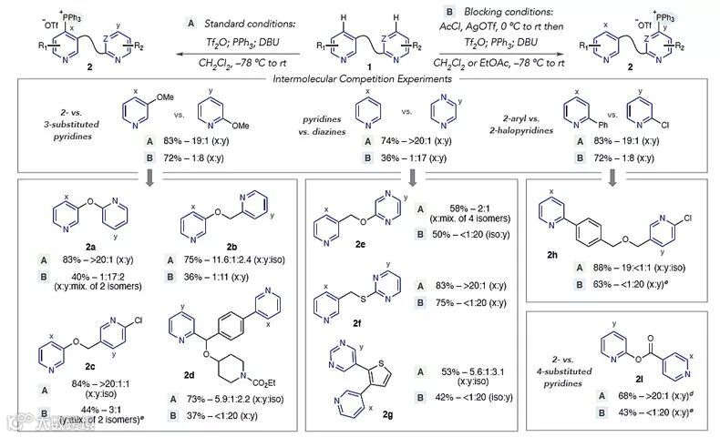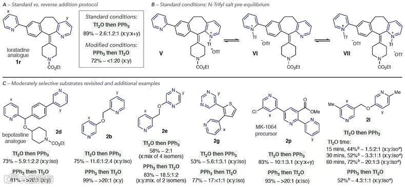 标准的反应物添加顺序是先加入Tf2O、再加入PPh3,添加顺序颠倒时,产物的选择性显著提高,并取得较好的收率,与此同时生成少量的Ph3P=O。这一现象可以通过标准条件下存在吡啶-Tf盐异构体V、VI和VII的平衡来解释。当1q与Tf2O搅拌时,1H NMR谱跟踪表明所有吡啶质子的位移向低场移动,由此证实Tf盐异构体间存在快速交换,区域选择性与V、VI和VII的比例有关。体系中存在PPh3时加入Tf2O,产物的区域选择性反映了吡啶-Tf盐V形成最快,并可与PPh3快速反应。随后,他们对其他中等选择性的底物进行了考察,还选择其他底物进一步探究试剂加入顺序对选择性的影响。可产生鏻盐异构体混合物的贝他斯汀类衍生物(2d)能通过改变加料顺序使反应结果得到显著改善。