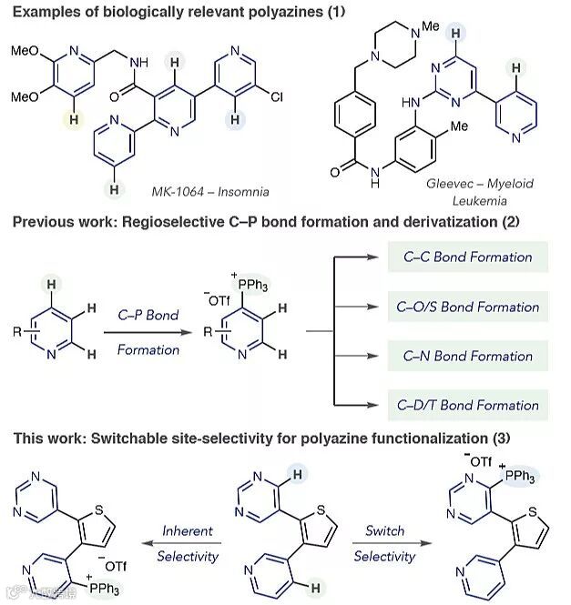 大部分生物活性分子的结构往往较为复杂,想要迅速地获得相关结构的分子用于构效关系的研究和药物研发,高效的合成方法便表现出极大的优势。然而,位点之间反应性的差异往往取决于底物位阻和电子效应微妙的差异,如何有效地实现以上过程成为人们需要思考的问题。许多药物分子中都包含多个吡啶和二嗪结构,发展区域选择性的C-H键活化反应,实现包含多个氮杂环的结构中特定C-H键的官能化具有十分重要的实际应用价值,从而规避从简单的起始原料进行合成。