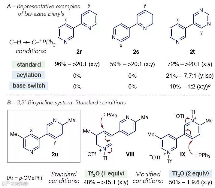 作者还分别考察了其他联吡啶-吡啶和吡啶-二嗪底物,反应具有良好的区域选择性,与底物中不同芳香杂环和Tf2O反应的活性相关。而酰基化阻断和碱调控策略都会导致联吡啶2r和2s参与反应时没有预期产物形成。作者猜测可能是由于以上底物形成的邻吡啶盐亲电性增强,PPh3与盐的Tf部分发生反应,并进一步氧化。当3,3'-联吡啶作为底物时,加入P(p-OMePh)3作为亲核试剂比PPh3的选择性更好。