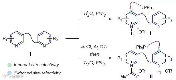 作者推测第一阶段C-P键的形成将受到亲核氮杂环化合物空间位阻和电子效应的影响,并且当一种氮杂环化合物对Tf2O具有很高的反应活性时,区域选择性会更加明显。如果反应仅有单一的三氟甲磺酸盐异构体形成(I),PPh3可选择性地引入包含多个氮杂环化合物(1)中的一个杂环。此外,作者还设想在加入Tf2O之前将反应活性更高的氮杂环酰化,由此调控反应的区域选择性。对于双三氟甲磺酸盐(II),PPh3更容易与亲电性更强的非酰基化吡啶鎓盐反应。