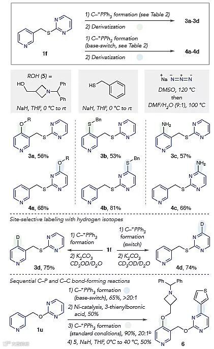 为了证明该反应的实用性,作者还设计了一系列的衍生化反应。吡啶-嘧啶类底物1f的两种异构体都可以在标准条件和碱调控的条件下高区域选择性地发生反应。他们利用以往报道的方法考察了碳-杂原子键的形成、同位素交换以及碳-碳键形成反应,都取得了理想的区域选择性。