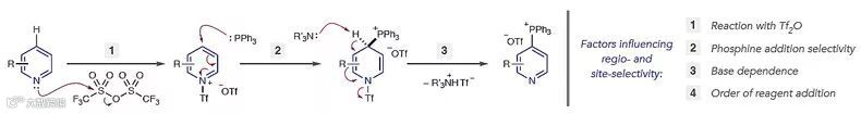 作者认为C-P键形成的三个阶段都会影响区域选择性:杂环氮原子对Tf2O亲核进攻、PPh3对活化的吡啶三氟甲磺酸盐亲核进攻、碱参与的消除反应重新实现芳构化。此外,作者同样认为试剂添加的顺序等反应参数对反应的选择性也存在影响。