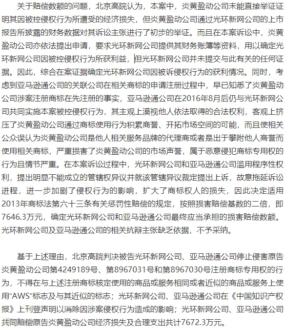 此外,北京高院指出,由于光环新网公司及亚马逊通公司的被控侵权行为不仅具有造成混淆误认的可能性,而且在现实的商业活动中已经发生了实际混淆,因此,光环新网公司及亚马逊通公司应当承担消除影响的民事责任。炎黄盈动公司请求判令光环新网公司及亚马逊通公司在《中国知识产权报》刊登声明、消除影响的诉讼请求于法有据,予以支持。