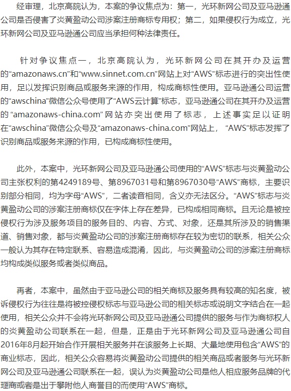针对争议焦点二,北京高院认为,本案中,光环新网公司与亚马逊通公司于2016年8月签订《运营协议》,约定AWS(中国)北京区域的云服务将由光环新网公司运营和提供,亚马逊公司将继续向光环新网公司提供技术支持和专业指导;光环新网公司按照约定向亚马逊公司付费,作为亚马逊公司提供技术服务、支持以及授权的对价。因此,基于光环新网公司及亚马逊通公司在被诉侵权行为中的分工合作且共享侵权利润的事实,可以认定被控侵权行为系由光环新网公司和亚马逊通公司共同实施的,光环新网公司与亚马逊通公司应当共同承担侵权责任。光环新网公司和亚马逊通公司的相关涉案行为侵害了炎黄盈动公司的注册商标专用权,光环新网公司及亚马逊通公司应当立即停止侵权行为,不得在与炎黄盈动公司涉案注册商标核定使用的商品或服务项目相同或者近似的商品或服务上使用包含“AWS”的标志及与其近似的标志。