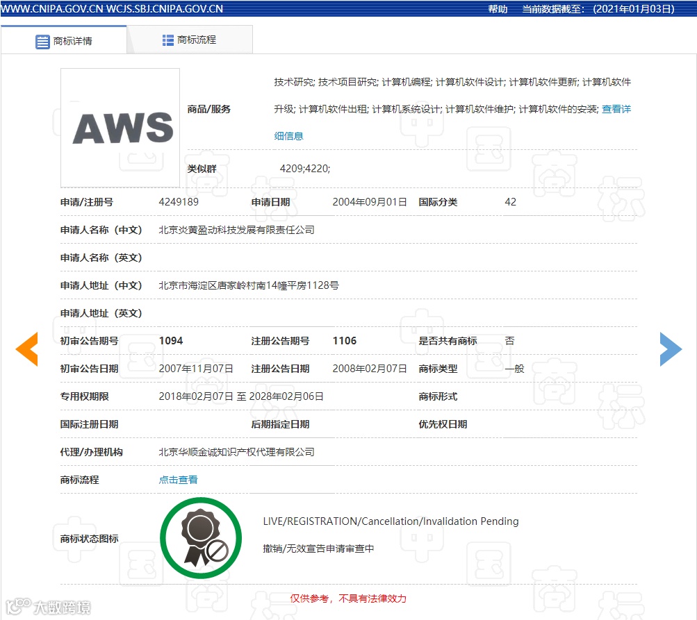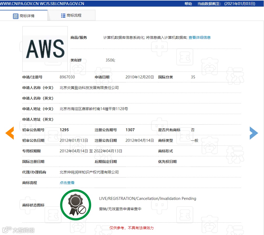 公开资料显示,炎黄盈动公司是一家BPM(Business Process Management,业务流程管理)基础软件公司。光环新网公司是一家专业的数据中心及云计算服务提供商。亚马逊通公司的主营范围为开发网络技术和电子商务技术等,该公司大股东为亚马逊科技资源有限公司。(2018)京民初127号民事判决书显示,自2016年8月起,光环新网公司与亚马逊通公司开始合作开展相关服务并在该服务上长期、大量地使用包含“AWS”的商业标志。