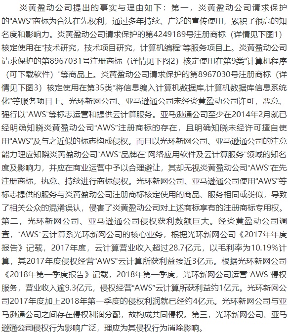 炎黄盈动公司向北京高院提出诉讼请求,请求法院判令光环新网公司立即停止侵权行为,包括但不限于停止在其开办的www.sinnet.com.cn网站使用“AWS”“AWS及图”标志;停止使用“AWS”“AWS及图”标志作为搜索引擎关键词;停止在其开办的amazonaws.cn网站使用“AWS”“AWS及图”标志;停止在其商业经营行为中使用“AWS”“AWS及图”标志或与之近似的标志;判令亚马逊通公司立即停止侵权行为,包括但不限于停止在其运营的“AWS云计算”微信公众号“awschina”中使用“AWS”“AWS及图”标志或与之近似的标志进行与云计算服务相关的经营或宣传;停止将“AWS云计算”作为微信公众号名称;停止在其任何商业经营行为中使用“AWS”“AWS及图”标志或与之近似的标志;判令光环新网公司和亚马逊通公司共同赔偿炎黄盈动公司经济损失3亿元;判令光环新网公司和亚马逊通公司共同赔偿炎黄盈动公司维权合理支出26万元;判令光环新网公司和亚马逊通公司在《中国知识产权报》上刊登声明,消除侵权影响。