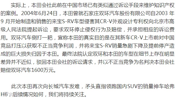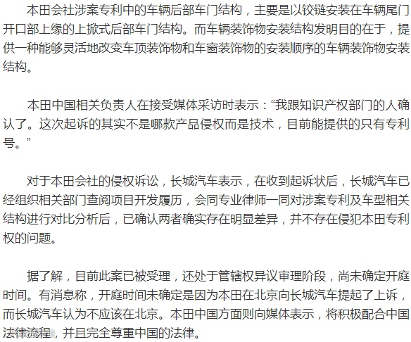 近日有消息传出,北京知识产权法院受理了本田技研工业株式会社(以下简称“本田会社”)诉长城汽车股份有限公司(以下简称“长城汽车”)、北京泊示联汽车销售中心(以下简称“泊示联”)两起侵害发明专利权纠纷,此案涉及到长城汽车制造、销售的哈弗H6车型,涉案标的额共计2214万元。据了解,早在2017年10月5日长城汽车就已收到北京知识产权法院的起诉状。