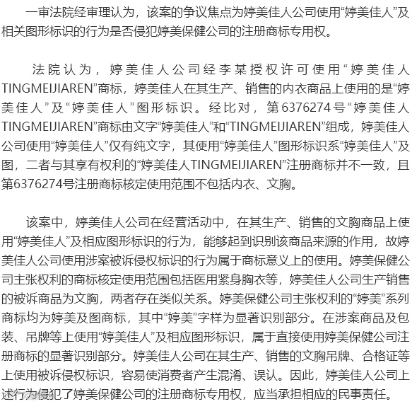有业内人士表示,该案中,婷美佳人公司使用的涉案标识与其享有权利的注册商标并不一致,且婷美佳人公司的注册商标核定适用范围并不包括内衣、文胸。山东瀛岱律师事务所律师黄志帅在接受本报采访时表示,该案判决也为相关企业敲响了警钟,企业应正确规范使用注册商标,避免侵权风险。