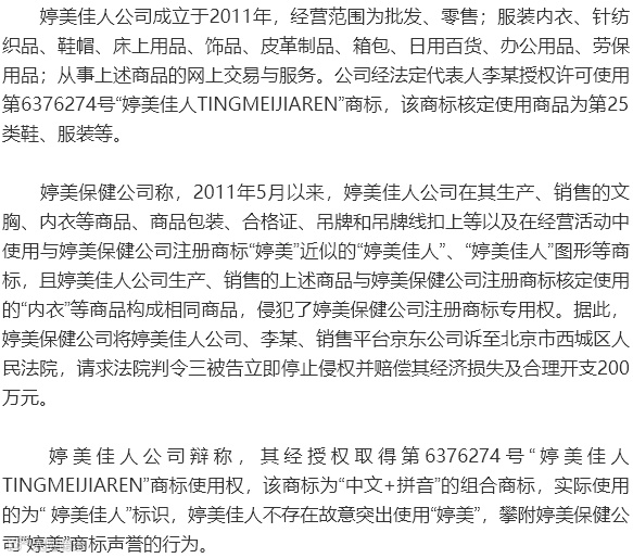 近日,北京知识产权法院审结了婷美保健科技股份公司(下称婷美保健公司)诉婷美佳人(厦门)服饰有限公司(下称婷美佳人公司)、李某及北京京东叁佰陆拾度电子商务有限公司(下称京东公司)的商标侵权纠纷案,维持一审判决,即婷美佳人公司立即停止实施侵犯婷美保健公司“婷美”系列商标专用权的涉案侵权行为,赔偿婷美保健公司经济损失及合理支出费用共33万元。