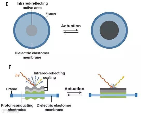 受此启发,研究者设计了一种基于介电弹性体致动器的新结构体系,包括可传导质子的底电极、介电弹性体膜、可传导质子的顶电极和红外反射涂层(下图E/F)。随着致动开始和结束,介电弹性体膜会伸展和恢复,使得红外反射活性区域面积变大和复原(下图E),这就好似乌贼皮肤上的色素细胞;而且红外反射涂层的表面形貌也会相应发生变化(下图F),这就好似乌贼的虹彩细胞。