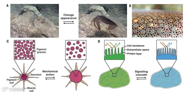 这种新材料的红外“隐身”原理并不复杂,但说起来容易做起来难。该团队第一个要解决的问题就是如何实现动态调节。研究者需要的材料需要具有自适应特征,即精确、敏感、实时地响应周围环境的变化。迄今为止,只有很少的自适应红外系统被报道,无一例外需要严格的条件和苛刻的技术指标。在生物界,乌贼等头足类动物皮肤在数百毫秒就可改变颜色和图案并融入环境,堪称“伪装大师”(下图A/B)。与一些人类“大师”一样,这些头足类“大师”的神奇手段也不是什么超自然力量。它们柔软弹性的皮肤上存在包含众多色素颗粒的色素细胞和反射光线的虹彩细胞(iridocytes),前者可通过伸缩来吸收和反射特定波长的可见光(下图C),而后者通过改变细胞表面的包膜蛋白质层及胞外空间来调节细胞微形貌和折射率(下图D),从而实现伪装。
