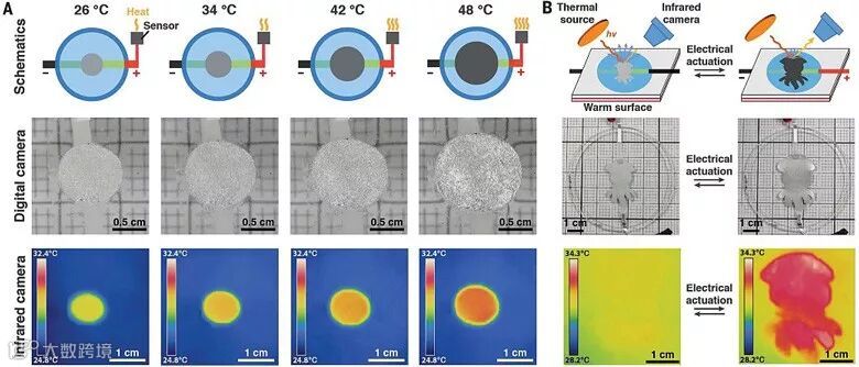 更进一步,研究者使用独立的温度传感器来感受环境温度,并据此改变电场,由此来控制实现材料的自动调节。随着温度升高,电压就会随之改变,材料变大变平,红外反射增加,与环境的表观温度差也随之增加(下图A)。可能作为对“乌贼老师”的致敬,研究者将这种材料制备成乌贼的形状,利用红外摄像机进行试验。电致动之前,乌贼形状的新材料与环境表观温度差可忽略不计,在红外摄像机下不可见;电致动时,新材料“乌贼”变大变平,红外反射增加,与环境表观温度差比较明显,使其清楚地出现在红外摄像机图像中;电致动结束,新材料“乌贼”恢复原状,红外反射减少,与环境表观温度差降低,在红外摄像机下就再次“隐身”了(下图B)。