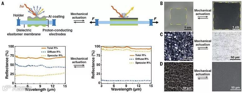 机械调控下的反射性质变化(A)及数码相机(B)、光学显微镜(C)和扫描电镜(D)下的形貌变化。图片来源:Science