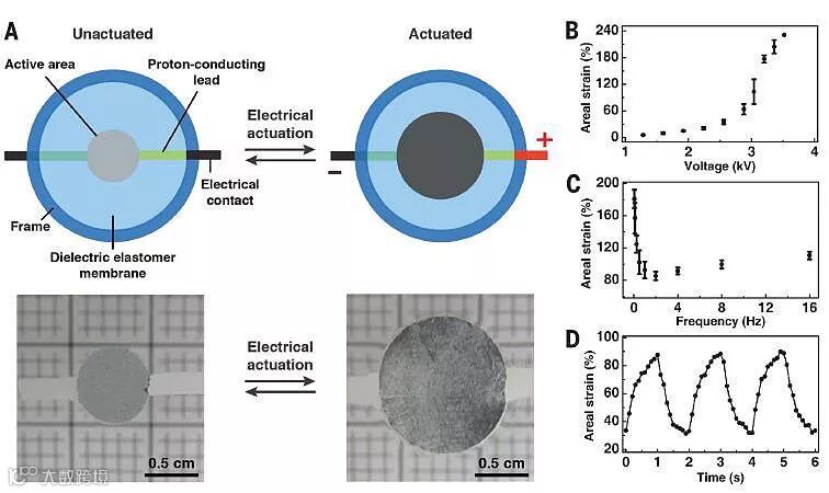 随后,研究者不满足于机械力刺激,他们使用电刺激也实现了红外反射调控。通过施加电压,可以触发介电弹性体膜厚度和面积的改变,使其变大变平。这就改变了材料表面的红外反射性质,而且该过程一样可逆。此种材料的形变程度与外加电压有关,当电压在3.5千伏附近时,最大应变约为230%。同时,面应变还依赖于所施加电压的频率。