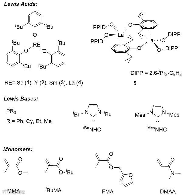 苏州大学的徐信教授研究团队在前期研究工作中发现,基于阳离子型或者中性稀土金属芳氧基化合物的分子内路易斯碱对化合物不仅可以协同活化一些小分子底物,同时也可以催化MMA及其环状类似物的聚合反应(Chem. Eur. J., 2017, 23, 1263; Dalton Trans., 2017, 46, 4514)。机理研究表明,这类聚合反应是由新型的稀土路易斯酸/膦路易斯碱对底物的1,4-加成反应引发,而不是上述传统的引发方式。最近,该课题组发现直接使用简单易得的三芳氧基稀土化合物作为路易斯酸,结合商品化的膦烷或氮杂环卡宾路易斯碱,形成的分子间路易斯酸碱对体系可以高效地催化如下一系列极性烯烃单体的聚合。