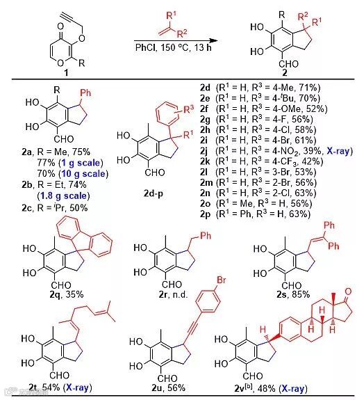 首先,作者尝试了金催化的克莱森重排反应,并用苯乙烯作为捕捉试剂,很遗憾都没有观察到期待的产物。最后,作者发现升高温度,不加任何添加剂和催化剂就可以高效的转化,并确定了最优条件:以PhCl 或 DCE为溶剂在150 ℃氮气保护条件下反应。
