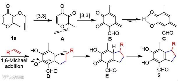 作者分析认为该反应机理是:首先在加热条件下发生两次克莱森重排反应得到中间体B,接着发生互变异构得到对亚甲基苯醌C,其和苯乙烯发生1,6-Michael加成,再经Friedel-Crafts反应,芳构化得到最终产物2(图5)。