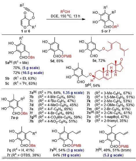 接着,作者利用醇作为亲核试剂对底物进行了进一步的拓展(图6)。不同的麦芽酚衍生的炔丙醚的反应产率都较好,并且能十克级制备。含羟基的天然产物香叶醇和去氢表雄酮也能和中间体发生反应,分别以72%和54%的产率生成目标产物5e和5f。随后,作者对非末端炔醚上芳基的电性的影响进行了研究。结果表明产率受苯环上取代基电性的影响不大,酯基、氰基、噻吩等官能团都能兼容。另外,对于烷基取代的非末端炔醚也能够顺利进行反应。当炔上取代基改为烯丙基取代基时,烯丙基取代的全取代水杨醛衍生物7s和7t也能以40-64%的产率大量制备(5-18克),烯丙基的成功引入为棉酚及其类似物的全合成提供了可能。