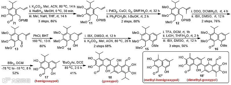 最后,作者利用串联重排所得全取代水杨醛7s和7t实现了天然产物半棉酚、棉酚及其类似物的全合成工作。以棉酚为例,7t首先经甲基化、硼氢化钠还原、Wacker氧化和Wittig烯基化等转化得到12,其在DDQ氧化下脱除PMB保护基,再经IBX氧化得到Alder-ene反应前体13。在克级规模下13以80%的产率转化为14,其再经IBX氧化和甲基化得到萘环化合物15。在文献报道的条件下,15选择性脱甲基保护,再通过IBX氧化和三溴化硼脱掉所有甲基得到半棉酚17。最后,通过自由基氧化偶联完成了棉酚18的全合成(图7)。