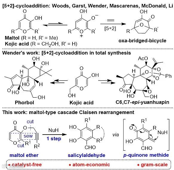 吡喃酮类天然产物麦芽酚(Maltol)和曲酸(Kojic acid),经常被用于氧代吡喃盐的[5+2]环加成成中(图3)。Wender教授巧妙的采用这中方法完成了复杂天然产物phorbol和C6,C7-epi-yuanhuapin的里程碑意义的全合成。在该反应中吡喃酮作为5-碳合成子来构建氧桥双环体系。作者在本文中报道了吡喃酮类化合物的一种全新的反应模式:基于麦芽酚衍生物的“切断-缝合”(cut-and-sew)策略,通过串联克莱森重排构建对亚甲基苯醌,其和亲核试剂发生1.6-迈克尔加成得到多取代水杨醛。该过程中吡喃酮骨架被切断后重新缝合为苯环结构。该反应不需要催化剂,可大量制备,原子经济性100%。