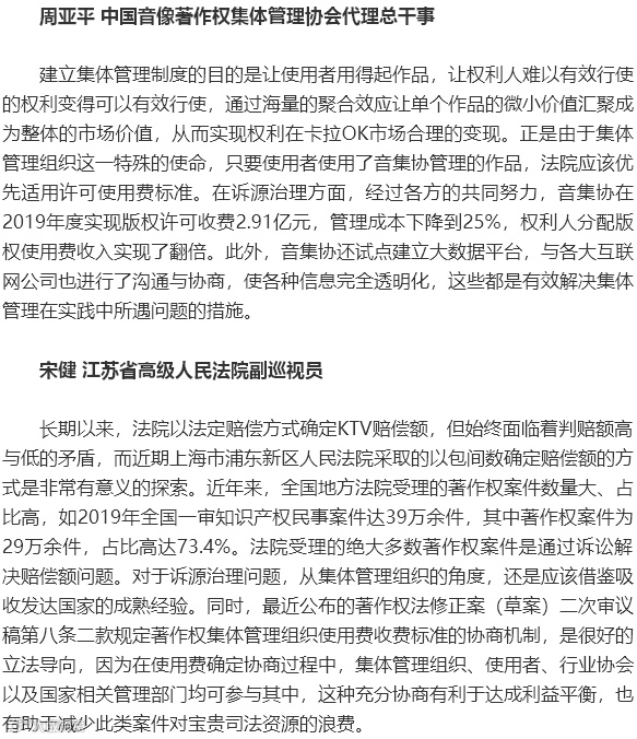 卡拉OK行业版权官司高发,反映出KTV音像作品许可使用的机制有待完善。如何破解这些难题,促进KTV行业健康发展,加强诉源治理?此次沙龙以“涉KTV著作权侵权案件审判实务”为主题,邀请知名学者、专家、法官、律师、业界代表和使用者代表,集中讨论了KTV著作权侵权案件在审判实务中遇到的热点和难点问题。“卡拉OK案件中涉及的各方利益主体是命运共同体,需要找到平衡的结合点,共同成长,促进这一市场的进一步繁荣发展。”浙江省高级人民法院审判委员会专职委员许惠春的话说出了此类案件审理的关键所在。