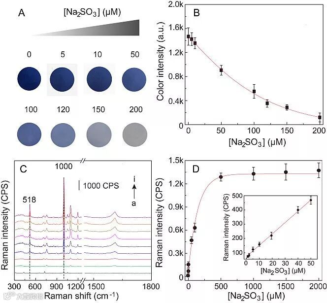 图2. rGO/MPy-GNRs/SIC纸传感器用于二氧化硫的比色和SERS检测。(A)纸基传感器用于不同浓度Na2SO3比色检测的颜色变化;(B)颜色强度与Na2SO3浓度之间的关系;(C)纸基传感器用于不同浓度Na2SO3SERS检测的光谱变化;(D)518 cm-1 处拉曼光谱峰的强度与Na2SO3浓度之间的关系。