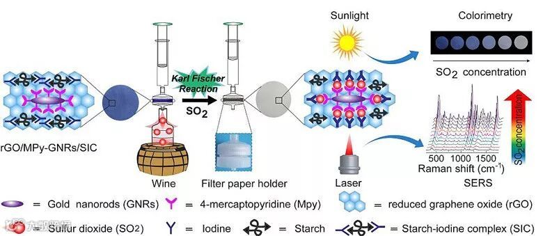 近日,上海应用技术大学的李丹副教授和邓维教授合作提出了一种基于顶空进样的纸基传感器件(Headspace-Sampling Paper-Based Analytical Device,HS-PAD)。通过在纸片上原位负载还原氧化石墨烯、对巯基吡啶修饰金纳米棒和碘-淀粉复合物(rGO/MPy-GNRs/SIC),并巧妙借助卡尔-费休反应,他们设计了一种全新的纸基多功能传感探针(图1)。在微量水存在的情况下,二氧化硫与纸片上的对巯基吡啶和碘-淀粉复合物之间发生卡尔-费休反应,结合顶空进样技术实现了二氧化硫在纸基传感器表面的特异性吸附。该方法一方面可解离碘-淀粉复合物诱导纸片颜色褪色,另一方面可将对巯基吡啶分子转化为吡啶甲基硫酸盐而获得特异表面增强的拉曼光谱(SERS)信号。该探针不仅可以提高二氧化硫气体分子的富集效率及分析检测灵敏度,而且实现了二氧化硫分子的原位比色和SERS双传感检测,降低了分析检测中出现假阳性或假阴性的几率,较好地弥补了传统比色传感器的缺陷。