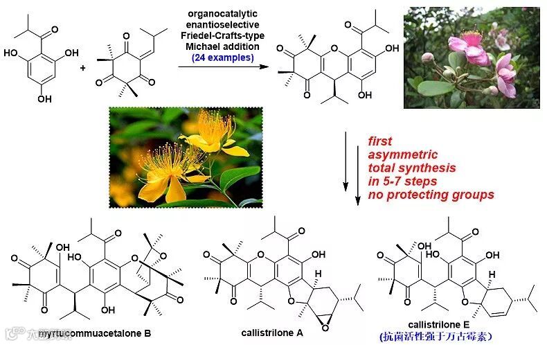 作者开发了一条高效简洁的合成新策略,由廉价、商业可得的原料出发,利用新开发的高对映选择性傅克类型的迈克尔加成反应,快速构建具有较大合成挑战性的间苯三酚二聚体。在此基础上,他们利用新开发的迈克尔缩酮串联增环反应,立体选择性、区域选择性地合成了6/6桥环和6/5并环笼状三元环核心骨架,只需7步即可首次完成Myrtucommuacetalone和Myrtucommuacetalone B的不对称全合成,对映选择性大于99%,总产率高达31.0%,并确定了Myrtucommuacetalone的绝对构型。此外,他们利用氧化[3+2]环化反应,立体选择性、区域选择性地合成了6-5-6三环核心骨架,只需5-6步,即可首次完成Callistrilones A、C、D、E的不对称全合成,对映选择性大于99%,总产率高达12.7-24.9%。以上分子的合成都没有使用任何保护基修饰。此外,该课题组对上述不对称合成的6种天然产物进行了抗菌活性实验,发现化合物Callistrilone E对耐药型的革兰氏阳性菌(如MRSA、VISA和VRE)的抑制作用(0.25-2 μg/mL)强于万古霉素(2-8 μg/mL),具有成为新一代高效低毒抗菌药物的潜力,相关工作已申请专利。以上研究为后续开展拥有自主知识产权的抗菌创新药物进一步的药物学研究奠定了基础。