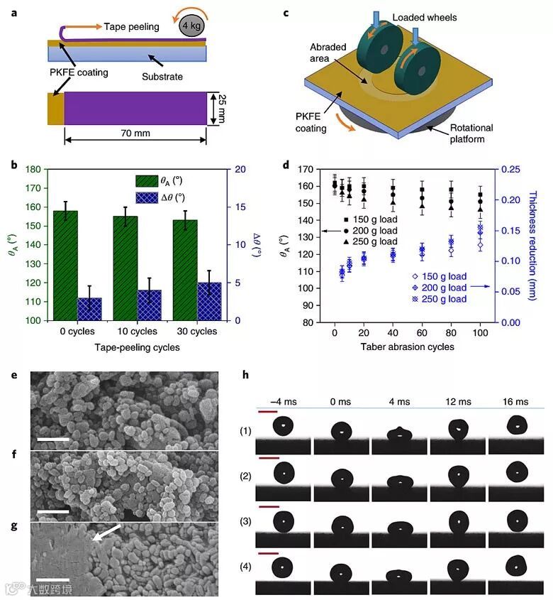 超疏水涂层机械稳定性测试。图片来源:Nat. Mater.