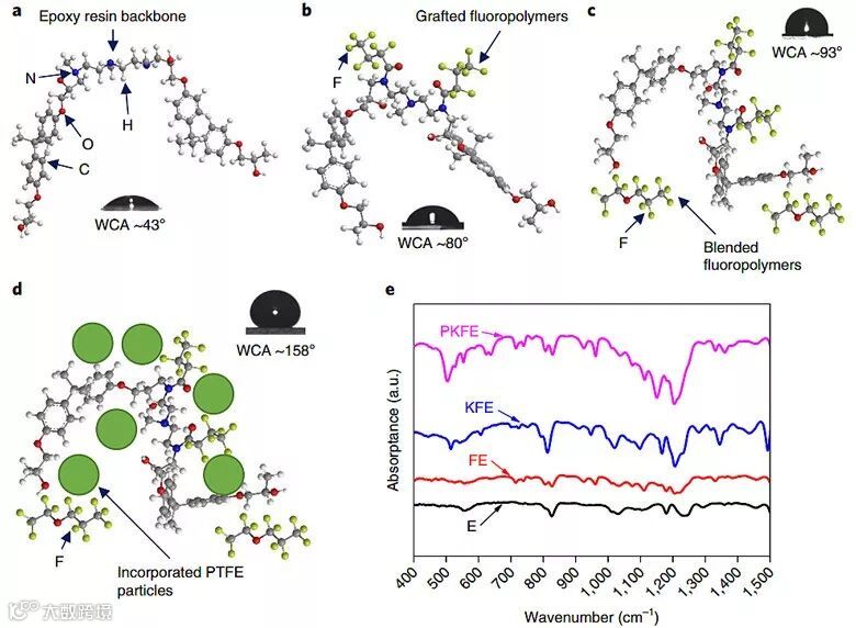 涂层组分的选择和组合花费了研究者不少功夫。环氧树脂的机械和化学稳定性上佳,通过亲水官能团还能分散纳米颗粒,并且具有强大的基材粘附力;全氟聚醚有助于调整涂层的表面能和柔性;含氟聚合物纳米颗粒能够提供结构控制并降低表面能。不过普通的环氧树脂未改性前表面水接触角(WCA)约43°(下图a),这种疏水性显然无法满足需要。研究者使用“多步氟化(multi-fluorination)”策略来制备高性能超疏水涂层。首先,他们使用含氟聚合物对环氧树脂进行接枝改性得到氟化环氧树脂(记为FE),以增强其疏水性,WCA增加到约80°(下图b)。他们在氟化环氧树脂中混入全氟聚醚(Krytox oil),赋予树脂(记为KFE)优异的柔性,同时进一步增加疏水性,WCA增加到约93°(下图c)。而后,通过加入含氟聚合物(聚四氟乙烯,PTFE)纳米颗粒,所得超疏水纳米复合物涂层(记为PKFE)的WCA提升至约158°(下图d)。研究者基于傅里叶变换红外光谱对多步氟化策略的各个过程所得产品进行了相应的表征(下图e),结果证明了二氟甲基和三氟甲基的存在,并且每一步的氟化过程都很成功。