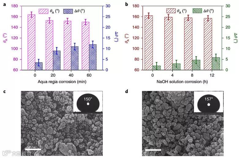 研究者进一步对超疏水涂层的化学稳定性进行测试。采用王水(60 min)以及NaOH溶液(1M,12h)浸渍后,涂层仍保持完整表面形貌和超疏水特性。