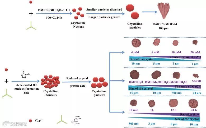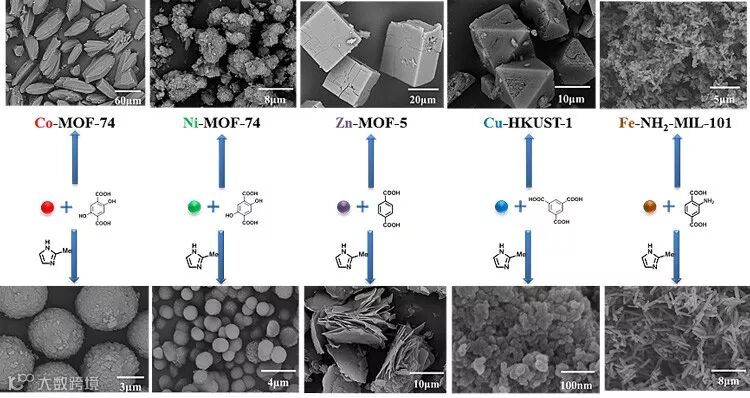 新疆大学的王吉德教授以2-甲基咪唑(2-MI)作为一种配位调控试剂,通过竞争配位作用调控晶体的成核及生长速率,从而制备得到五种具有特殊形貌和大小的经典MOFs(Co-MOF-74、Ni-MOF-74、Zn-MOF-5、Cu-HKUST-1和Fe-NH2-MIL-101)。