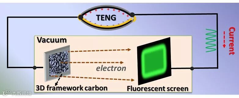 目前,场发射冷阴极都由直流连续或脉冲高压电源驱动,此类电源设备不仅价格昂贵、体积大、笨重,而且安全性较差,限制了冷阴极器件的进一步小型轻量化及便携化。寻找一种新的冷阴极驱动方式是很有必要的,也可满足不同工况下的使用需求。摩擦纳米发电机(TENG)基于摩擦起电以及静电感应原理,利用材料间摩擦引起的电荷转移,可将环境中的机械能转化成电能,实现能量收集和转换。TENG 可输出高电压及一定功率,可满足低压开启冷阴极的工作要求。阎兴斌研究员领导的团队采用三维网络碳制备了在直流连续电源驱动下具有良好发射性能的冷阴极;同时,研究人员尝试采用具有高压输出的TENG(最高输出电压800 V)来驱动三维网络碳冷阴极(图2示意图)。实验发现,采用TENG的高压输出完全可以实现冷阴极的电子发射,同时通过场发射电子轰击荧光屏可以观测到均匀的、持续的光斑,证实了采用TENG作为持续电能供给来驱动冷阴极的可行性。此工作为冷阴极真空电子器件进一步小型轻量化以及自驱动化提供可能。