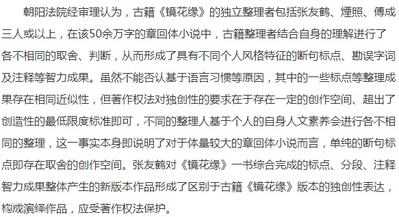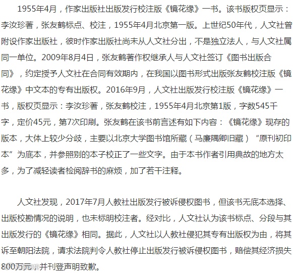近日,北京市朝阳区人民法院(下称朝阳法院)就人民文学出版社有限公司(下称人文社)诉人民教育出版社有限公司(下称人教社)出版发行的《镜花缘》(下称被诉侵权图书)一书侵犯其专有出版权纠纷案作出一审判决,判令人教社停止出版发行涉案图书,赔偿人文社经济损失300万元。