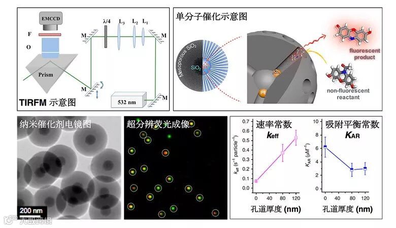 左上到右下:全内反显微成像光路原理图,限域效应下单分子催化示意图,纳米负载催化剂电镜图,超分辨荧光成像,和不同孔道长度下催化反应速率和吸附平衡常数比较图。