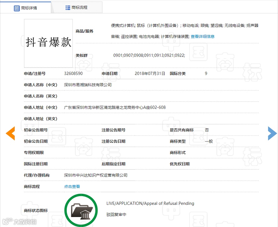 小编查询发现,字节跳动在2016年和2017年已经注册多个“抖音”商标,其中有6个“抖音”商标在第9类上。易湘瑞公司的“抖音爆款”商标想注册成功,是很难了!