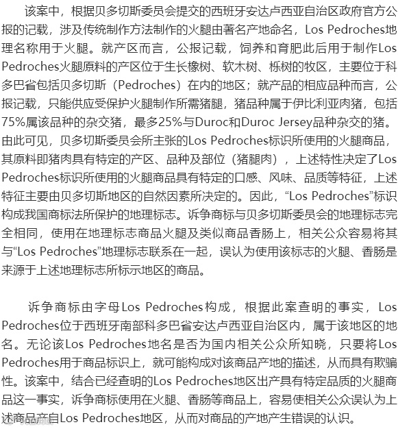 周某在第29类火腿、香肠等商品上申请注册了第9503392号“Los Pedroches”商标。西班牙贝多切斯委员会认为该商标侵犯被保护的地理标志“Los Pedroches”,向原国家工商行政管理总局商标局(下称原商标局)提出异议申请,原商标局裁定诉争商标不予核准注册。周某不服,提出异议复审,仍被驳回。周某向北京知识产权法院提起诉讼。