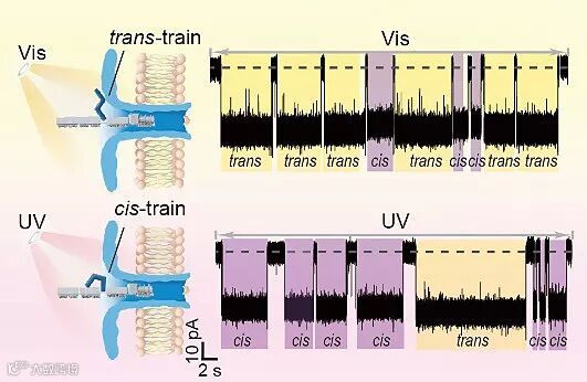 然而,单个分子机器的构建与操控一直是分子机器领域的长期挑战,缺少相应的研究方法与手段。华东理工大学费林加诺贝尔奖科学家联合研究中心的研究人员多年来聚焦构建基于单个生物分子的电化学限域纳米孔界面,发展非平衡态测量新方法。最近,田禾院士和龙亿涛教授团队合作在单个Aerolysin生物分子界面上成功构建了单分子“纳米火车”,实现了单分子火车的“行驶”状态的光调控。这一单分子纳米火车主体由五节“车厢”组成,每一个“车厢”对应一个碱基。其中一个碱基为偶氮苯替代的类碱基结构,从而使得整列“火车”具有光调控的性能。这列世界上最小的光控单分子火车可以在电场力的作用下逐次通过单个Aerolysin分子界面。在初始的状态下,偶氮苯处于反式状态,由于其较大的分子尺寸(9.0 Å),其与纳米孔之间产生较强的作用力,单分子火车的行驶速度较慢(1.9 碱基/s)。因此,反式偶氮苯可以看作是调节火车速度的“慢速齿轮”。在紫外光照下,偶氮苯基团由初始的反式状态异构成顺式状态。由于光异构导致分子尺寸的变化(顺式偶氮苯5.5 Å),顺式偶氮苯与纳米孔之间作用力变弱,即可视为“高速齿轮”使得单分子火车提速至6.3 碱基/s。可见光照射可以重新使顺式偶氮苯回到反式偶氮苯状态,即重新回复到初始的慢速状态,从而整列火车实现了“光控可逆调速”。而实现对每一个光控单分子火车运动轨迹的高时间分辨测量是利用了研究团队前期发展的动态高时空分辨测量装置系统。