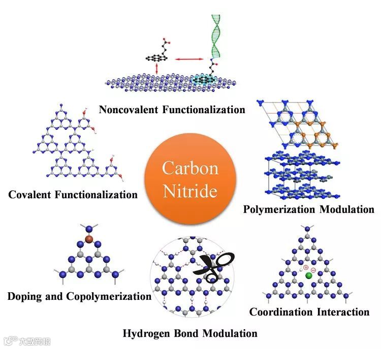 东南大学的张袁健教授团队自2009年来在氮化碳分子结构设计方面做出了许多原创性工作:较早报道了质子化的氮化碳材料,并在此基础上首次发现了氮化碳的光电化学行为(J. Am. Chem. Soc., 2009, 131, 50,ESI高被引);通过异相磷原子掺杂显著地提高了氮化碳的光电转化效率和导电性能(J. Am. Chem. Soc., 2010, 132, 6294,ESI高被引);通过质子化和插层效应显著提高了氮化碳的溶解度,并在此基础上首次发现了氮化碳的液晶相(J. Am. Chem. Soc., 2015, 137, 2179,ESI高被引);通过非共价修饰(Energy Environ. Sci., 2011, 4, 4517,ESI高被引;J. Am. Chem. Soc., 2017, 139, 11698);化学剪裁(ACS Nano, 2015, 9, 12480,ESI高被引)等方法成功制备了一系列新型的氮化碳纳米结构和异质结构材料,并探索了一系列基于氮化碳分子结构设计的独特应用,包括仿生竞争机制驱动的电致化学发光传感(J. Am. Chem. Soc., 2018, 140, 2801)和智能CO2响应性氮化碳水凝胶(ACS Nano, 2016, 10, 9036)。