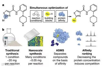 辉瑞的文章发表之后仅3个月,默沙东的Tim Cernak等人就在Nature 上发表文章,对他们之前报道的自动化高通量反应筛选平台进行了“大规模”升级,增加了一项重要功能——化合物生物活性测试。具体来说,在高通量的纳摩尔量级(每个反应消耗少于0.05毫克底物)偶联反应完成后,使用无需标记的亲和选择-质谱法(Affinity-selection mass spectrometry,ASMS)直接测定反应产物对靶标蛋白的亲和性,并进行排序,无需常规方法中极其耗时的纯化步骤,也避免了大量无亲和活性候选化合物的合成、分离等工作。他们将这种高通量纳摩尔量级合成和亲和性筛选排序一体化的新技术命名为NanoSAR(Nanoscale synthesis and affinity ranking)。结果表明,该技术可帮助他们快速地从3114个纳摩尔量级的偶联反应中筛选出可抑制靶标蛋白激酶CHK1的产物及其合成条件,大大加快了先导药物发现的速度,降低了稀缺原料的用量。并且,NanoSAR技术所发现的一些具有潜在活性的化合物,用常规手段完全无法发现。